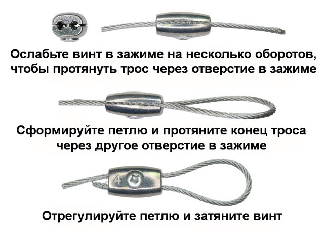 Для формування тросової петлі потрібно вкласти трос всередину корпусу, розмістивши його кінці між гвинтами затиску. Далі необхідно одягнути притискну пластину на затискач і затягнути шестигранні гвинти, зафіксувавши трос між корпусом і пластиною. Гайки рекомендується закручувати поперемінно, з тим, щоб уникнути нерівної фіксації пластини.